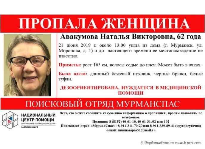 В Мурманске пропала пожилая женщина. В пятницу 62-летняя Нина Васильевна Авакумова ушла из дома на улице Миронова. До сих пор родственники не получили сведения о ней.