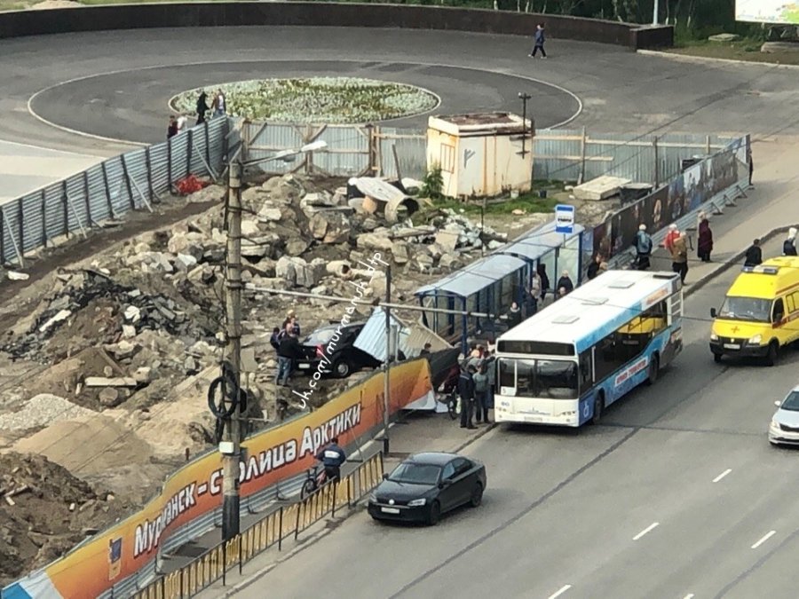 Автомобиль едва не сбил находившуюся недалеко мурманчанку, повредил остановку, пробил забор. В итоге машина оказалась около озера. Автомобиль серьезно пострадал.