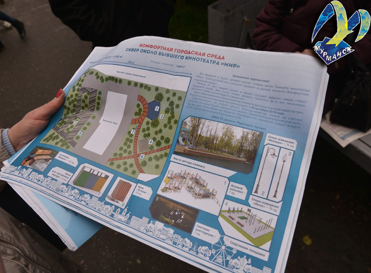 Возле бывшего кинотеатра «Мир» предлагается создать два пространства: одно – с детской и спортивной площадками, второе – тихое, с уютными лавочками и оригинальным освещением. Высказать свою позицию по этому вопросу мурманчане смогут 8 сентября в Единый день голосования.