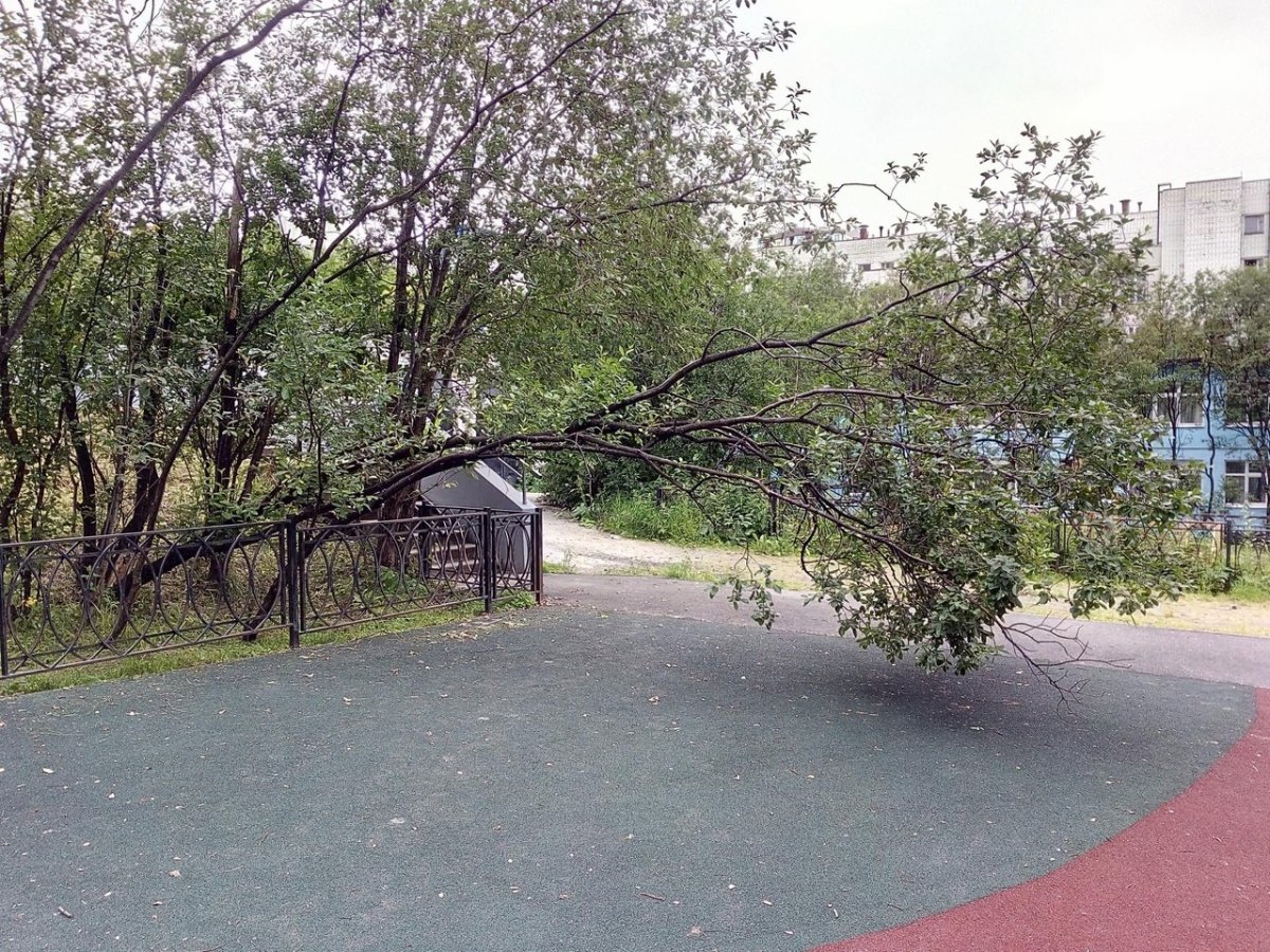 Жители Мурманска возмущаются деревом, не убранным с детской площадки в центре города. Оно находится там уже месяц. Дерево угрожающе нависает над площадкой и прохожими.