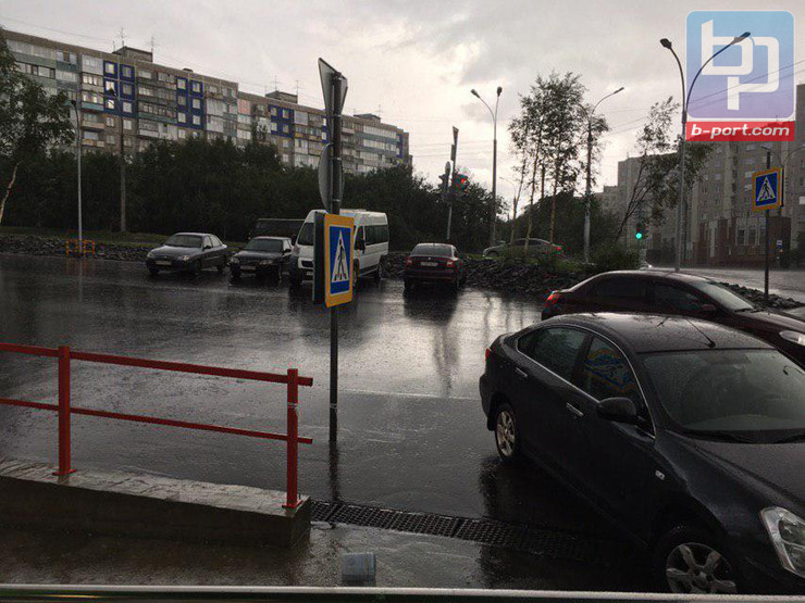 Сильный дождь в Мурманске образовал на некоторых улицах потоп, из-за чего дорожные полотна стали похожи на каналы и реки.