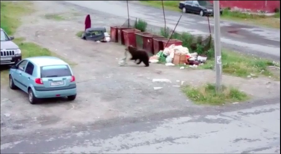 Жители Ревды опубликовали в Интернете видео, снятое вчера в поселке. На нем крупный медведь, который, не боясь, бродит по улицам. Косолапого привлекли мусорные контейнеры. Видимо, мишка почувствовал запах отходов съестного. Сначала зверь роется в мусоре. Потом находит что-то пахнущее едой, хватает его и убегает, но по дороге теряет добычу.