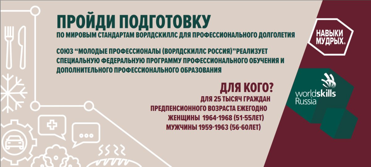 В 2019 году повысить квалификацию или обучиться новой профессии за счет средств федерального бюджета смогут мужчины 1964-1968 г.р. и женщины 1969-1973 г.р. Обучение по стандартам Ворлдскиллс поможет зрелым специалистам повысить конкурентоспособность и мобильность, тем самым укрепив свои позиции на рынке труда. Основная задача программы – приобретение или развитие у обучающихся практических умений и навыков.