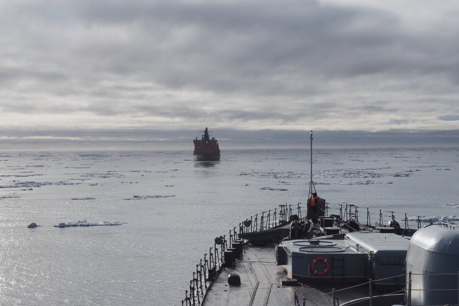 Путь через льды уверено прокладывает атомный ледокол «Вайгач». Тем не менее, на ледовую разведку регулярно вылетает вертолет. Возле острова Малый Таймыр группировка встретилась с гидрографическим судном, чтобы передать ученым продовольствие и топливо. Во время стоянки экипажи боевых кораблей начали проводить учения по противоподводно-диверсионной обороне.