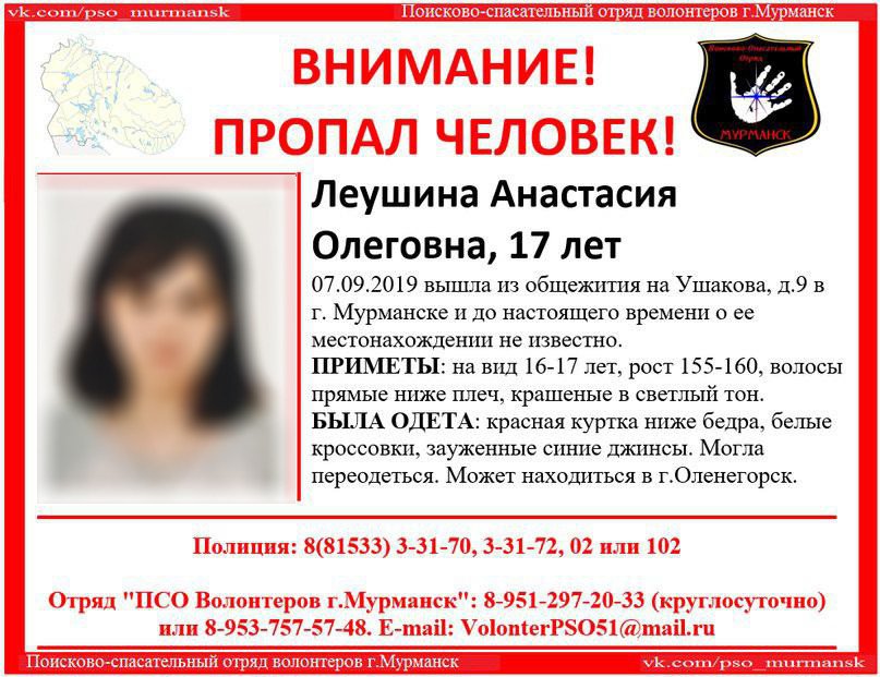 В Мурманской области разыскивают 17-летнюю Анастасию Леушину. Как сообщает отряд волонтеров «Мурманск», 7 сентября девушка вышла в Мурманске из общежития на улице Ушакова, дом 9, и до сих пор о ее местонахождении ничего не известно.