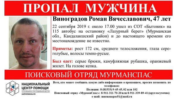 В субботу около 17 часов 49-летний Роман Вячеславович Виноградов ушёл из СОТ «Бытовик» на остановку «Лазурный берег» и до настоящего времени его местонахождение неизвестно.