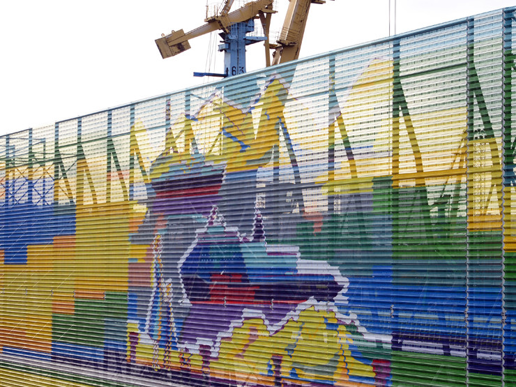 В АО «Мурманский морской торговый порт» завершилось создание еще одного панно на пылеветрозащитном экране, строительство которого идет в рамках экологической программы предприятия. Оно получило название «Врата в Арктику».