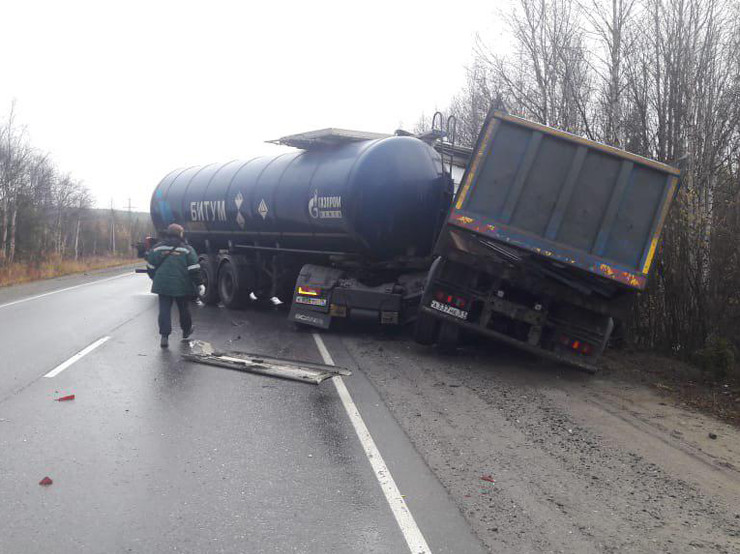 Как сообщили в Госавтоинспекции, ДТП произошло в 8:45 на 24 километре автоподъезда Апатитам. Водитель битумовоза во время совершения обгона не справился с управлением и допустил столкновение со стоящим на обочине КамАЗом.