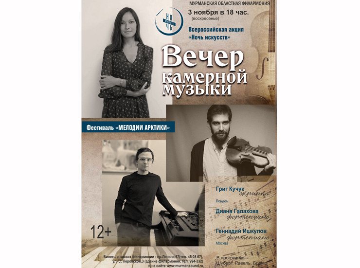 Мурманская областная филармония приглашает в воскресенье, 3 ноября, в 18 часов, в рамках Всероссийской акции «Ночь искусств» на вечер камерной музыки.