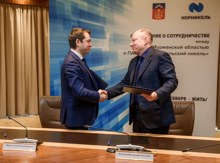 Сегодня в Москве состоялось подписание соглашения о сотрудничестве между президентом «Норникеля» Владимиром Потаниным и губернатором Мурманской области Андреем Чибисом. Сотрудничество будет направлено на развитие северного региона.