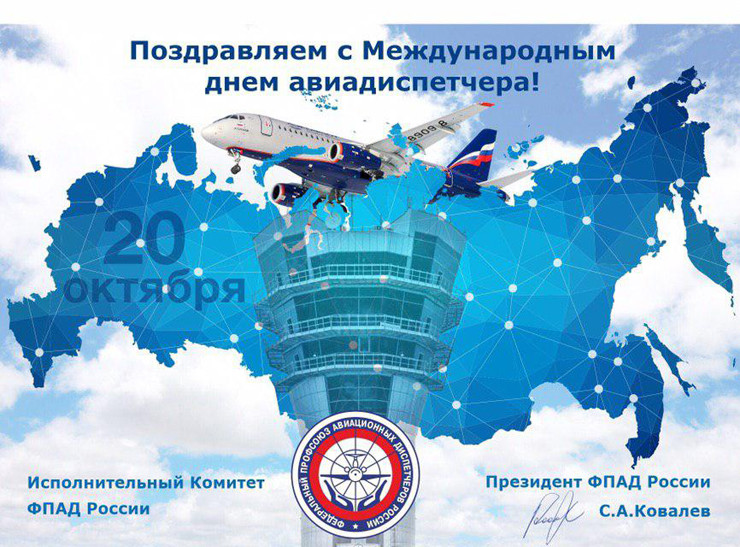 Федеральный профсоюз авиационных диспетчеров России поздравил авиадиспетчеров с профессиональным праздником, разместив на своем сайте коллаж. На картинке изображен печально известный SuperJet-100 с бортовым номером RA-89098.