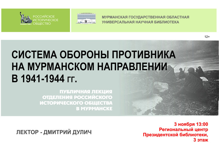Мурманчан приглашают в Мурманскую областную научную библиотеку послушать лекцию «Система обороны противника на Мурманском направлении в 1941-1944 гг.», которую прочитает профессиональный военный, исследователь военной истории и член клуба военно-исторической реконструкции «Заполярный рубеж» Дмитрий Дулич.