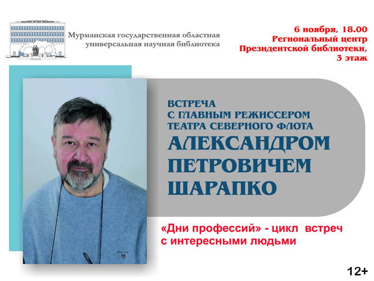 Мурманская областная научная библиотека организует в среду, 6 ноября, встречу с главным режиссером Драматического театра Северного флота Александром Шарапко. Мероприятие входит в цикл «Дни профессий», в ходе которого жители Мурманска знакомятся с разными профессионалами да и просто интересными людьми и узнают из первых рук все нюансы их работы.