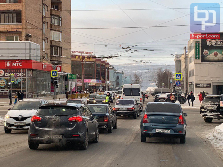 Сегодня днем в центре Мурманска на перекрестке проспекта Ленина и улицы Книповича движение распределяет регулировщик. Из-за отключения светофора на перекрёстке затруднилось движение транспорта.