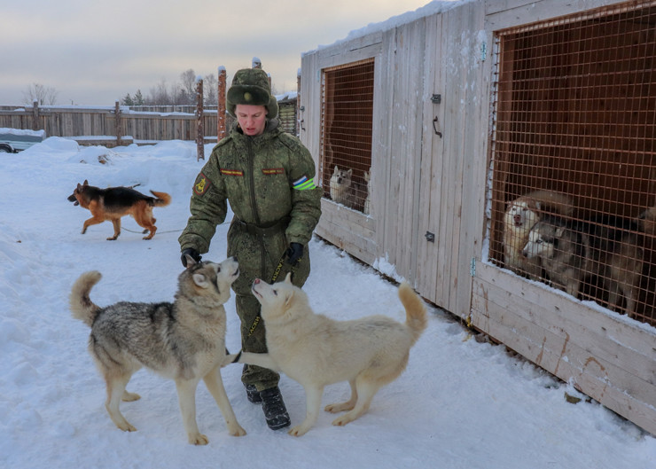Отмечается, что собаки готовятся к работе в упряжке. Дрессировкой и уходом за собаками занимается многократный призёр всероссийских состязаний по ездовому спорту рядовая арктической бригады Надежда Тимонина.