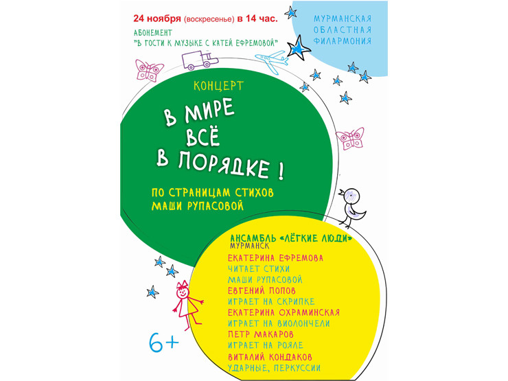 В это воскресенье в Мурманской областной филармонии в рамках абонемента для детей «В гости к Музыке с Катей Ефремовой» состоится концерт «В мире все в порядке», который исполнит группа «Легкие люди», по стихам Маши Рупасовой.