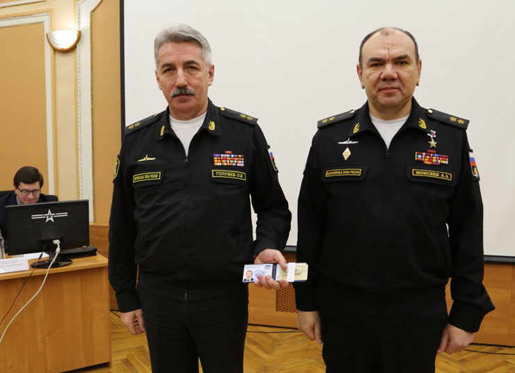 Командующий Северным флотом Герой России вице-адмирал Александр Моисеев вручил членские билеты новым участникам Русского географического общества — вице-адмиралу Виктору Соколову и командующему Кольской флотилией разнородных сил вице-адмиралу Олегу Голубеву.