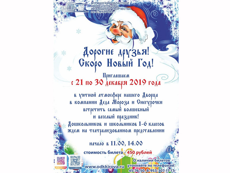 Дворец культуры и народного творчества имени С.М. Кирова традиционно приглашает всех мурманчан от мала до велика отпраздновать Новый год вместе с известными всем сказочными героями.