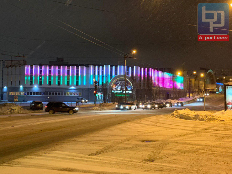 Ледовый дворец в Мурманске вот уже который день расцвечен яркими огнями диодных огней, имитирующих северное сияние. Около недели назад световое оборудование было установлено на фасад спортсооружения.