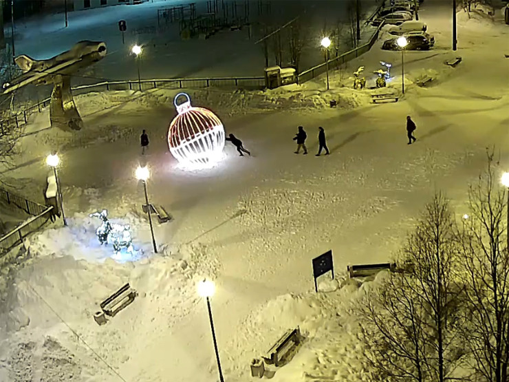 В Полярных Зорях группа подростков сломала световую инсталляцию в виде новогоднего шара. Кадры с инцидентом попала на камеру видеонаблюдения.