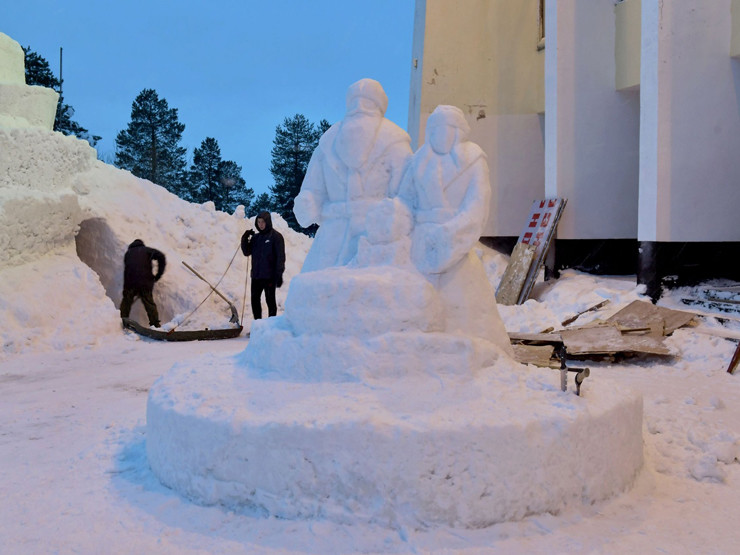 Михаил Сапарин ваяет новогодние скульптуры уже 26 сезон подряд. Так, например, в прошлом году жители поселка встречали Новый год со снежными Дедом Морозом, Снегурочкой, тремя поросятами и поверженным Серым волком.