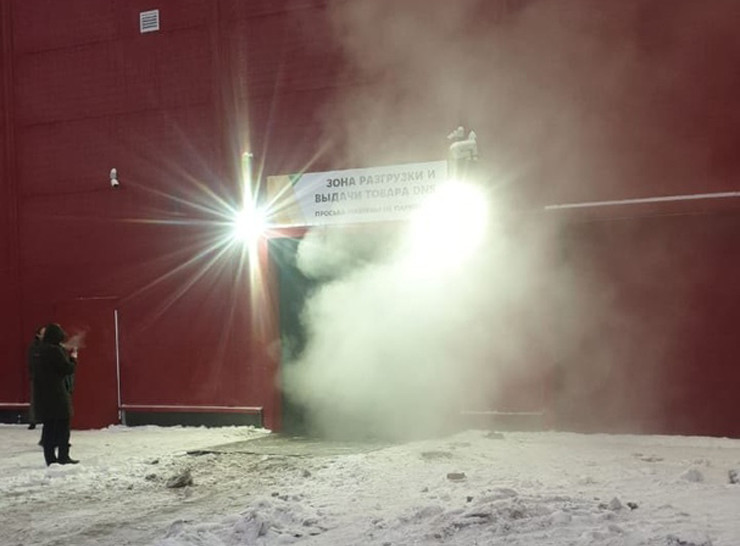 Очевидцы пишут, что горит в районе складов комплекса. На фото видны клубы дыма, вырывающиеся из-за дверей.