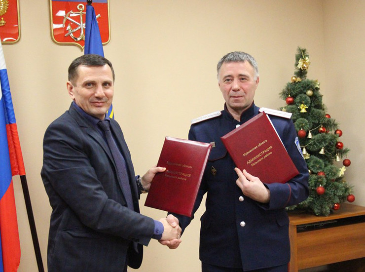 Соглашение о сотрудничестве с Кольским хуторским казачьим обществом подписала администрация Кольского района. На рабочей встрече 26 декабря присутствовали глава администрации Кольского района Александр Лихолат и глава Кольского района Андрей Малхасян.