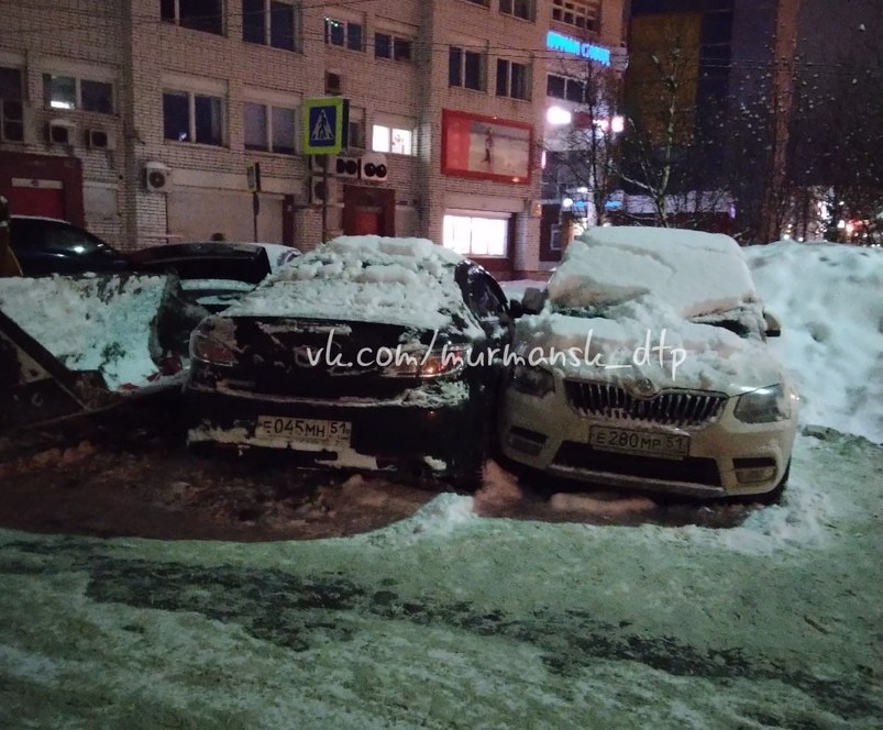Мурманчане активно обсуждают необычное ДТП, происшедшее вчера вечером на парковке около детской поликлиники на улице Папанина. Фото случившегося появились в социальных сетях. На них – снегоуборочный трактор, ковшом въехавший в стоящий на стоянке автомобиль, и рядом притерся еще один.