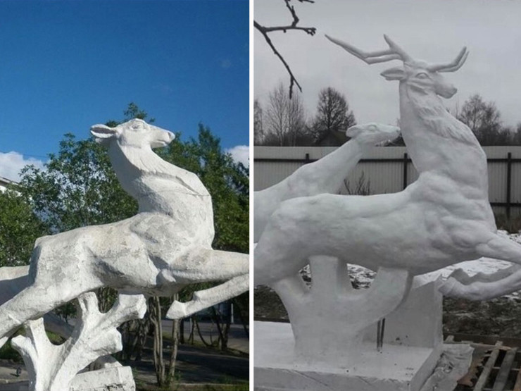 После этого было решено, что скульптуру необходимо заменить. По заказу местной администрации подрядчик начал работу по созданию новой скульптуры: олень с рогами длиной 2,7 метра и высотой 2,3 метра, а также олененок без рогов длиной 2,5 метра и высотой 1,6 метра. На это подрядчику был выделен почти миллион рублей.