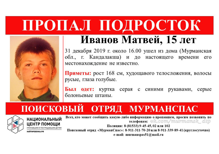 Всех, кому известная информация о местонахождении мальчика, просят сообщить в местный отдел полиции по телефону 8 (81533) 9-45-45 или 02, а также на горячую линию поискового отряда «МурманСпас».