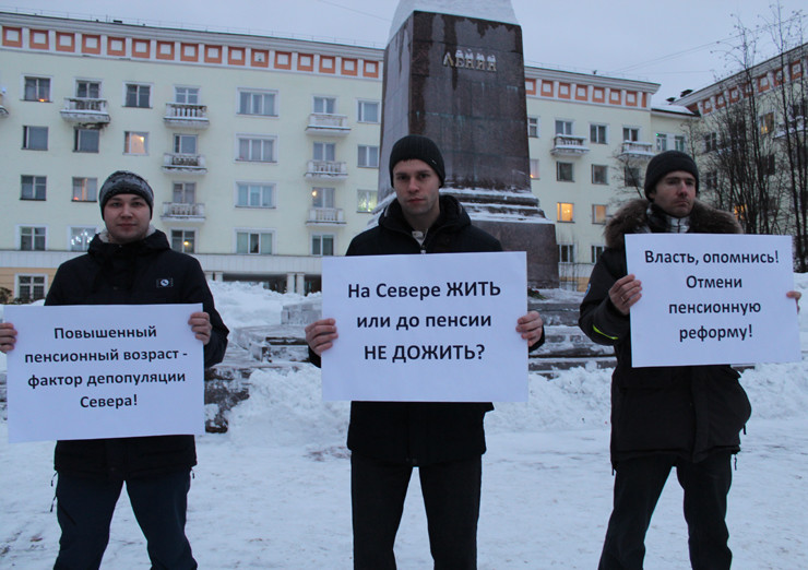 В Мурманске возле памятника Ленину прошёл пикет против пенсионной реформы. Организаторы отмечают, что акция проходит каждое третье число месяца после того, как 3 октября 2018 года президент России Владимир Путин подписал указ о проведении пенсионной реформы, которая подразумевает повышение возраста выхода на пенсию.