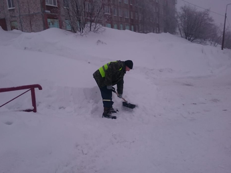 Работа по уборке снега проходит на территории города. О времени работы и оплате труда не уточняется.