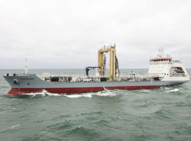 Средний морской танкер-снабженец «Академик Пашин» проекта 23130 оснащён дизельной одновальной установкой и оборудован устройствами для передачи жидких и сухих грузов кильватерным и траверзным способами прямо на ходу.
