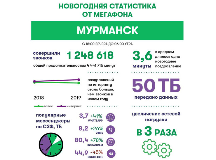Мурманские клиенты Мегафона также увеличили 4G-интернет-трафик в новогоднюю ночь на 46% по сравнению с предыдущим годом. Абоненты региона скачали свыше 50 Тб данных, что на 35% превышает последний результат.