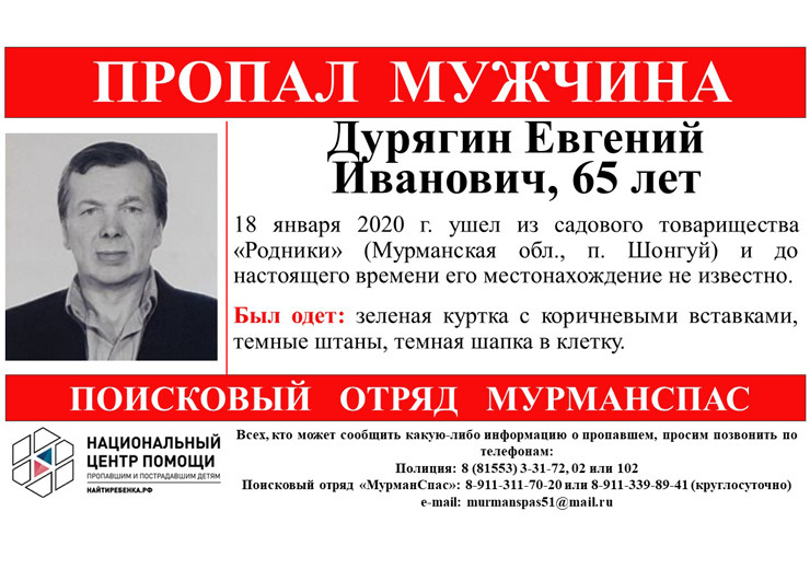 В Мурманской области ищут Евгения Дурягина. Как сообщает поисковый отряд «МурманСпас», 65-летний мужчина вышел из садового товарищества «Родники» в Шонгуе 18 января. С того времени больше о нем ничего не известно.