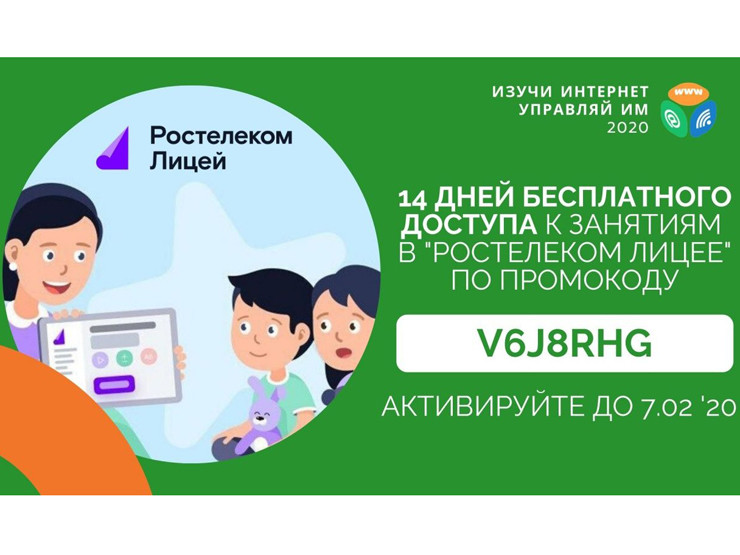 Для того чтобы получить бесплатный доступ на 14 дней ко всему контенту сервиса «Ростелеком. Лицей», необходимо зарегистрироваться на сайте www.lc.rt.ru и ввести промокод V6J8RHG в разделе «Мои занятия». Промокод необходимо активировать до 7 февраля (включительно).
