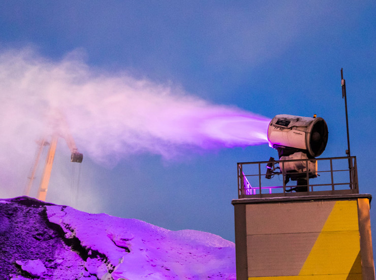 В Мурманском морском торговом порту реализован проект подсветки стационарных генераторов снега и водяного тумана TF10, не имеющий аналогов в других стивидорных компаниях на территории нашей страны. Такое креативное и яркое решение мурманских портовиков по визуальному оформлению оборудования системы пылеподавления является одним из элементов масштабной программы по подсветки сооружений, визуализации маршрутов и указателей АО «ММТП».
