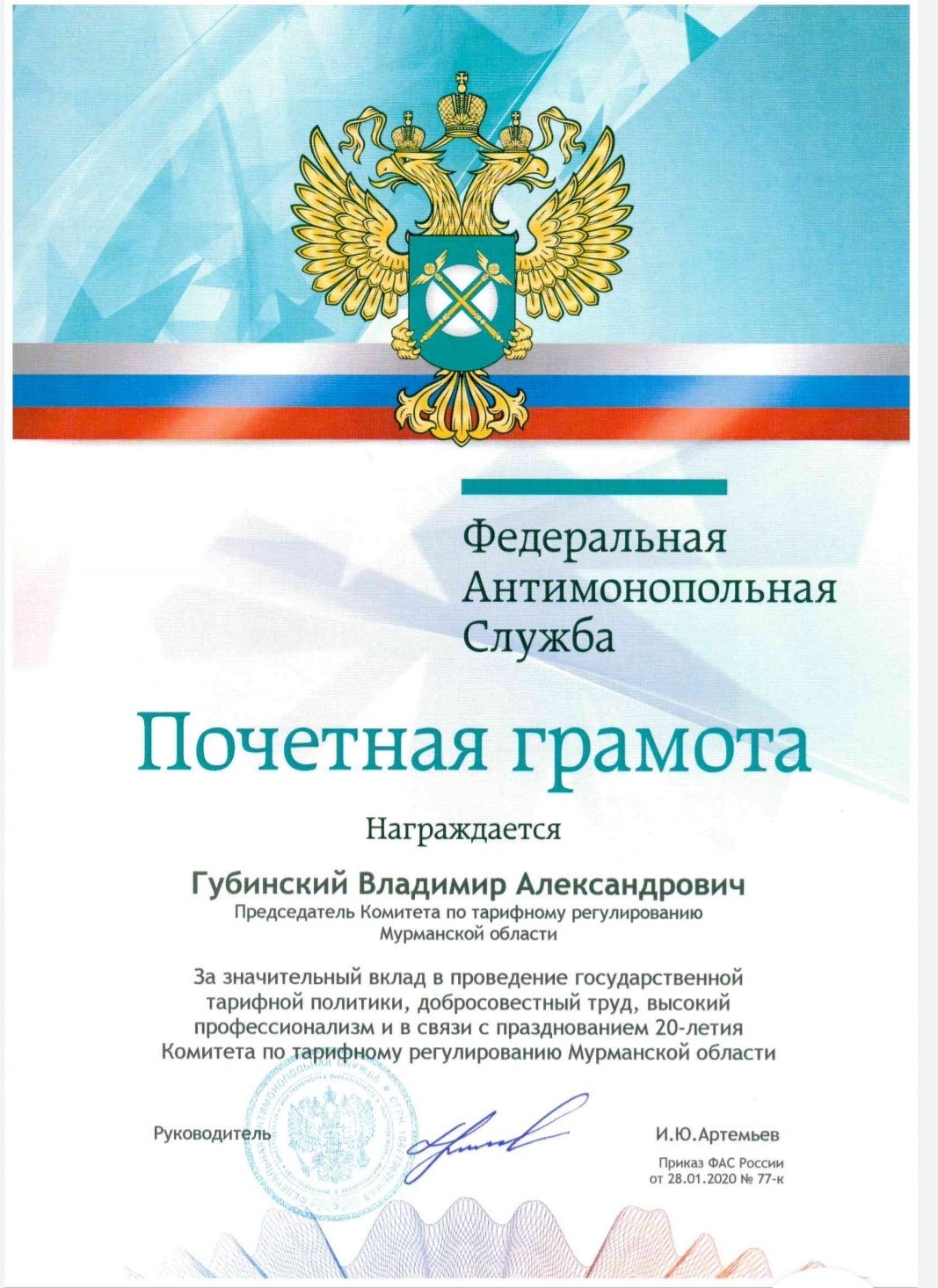 Владимира Губинского за вклад в проведение тарифной политики наградило руководство Федеральной антимонопольной службы.