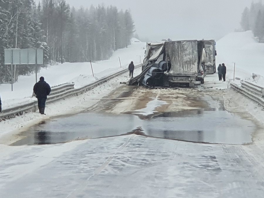 По сообщению УПРДОР «Кола», для ликвидаций последствий ДТП фуры с бензовозом, приведшего к разливу топлива, перерыт участок автодороги Р-21 «Кола» в районе 898 км.
