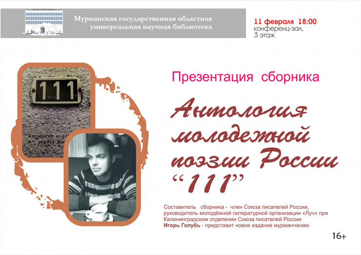 Презентация сборника «Антология молодёжной поэзии «111» Игоря Голубя состоится в Мурманской областной научной библиотеке 11 февраля в 18:00.