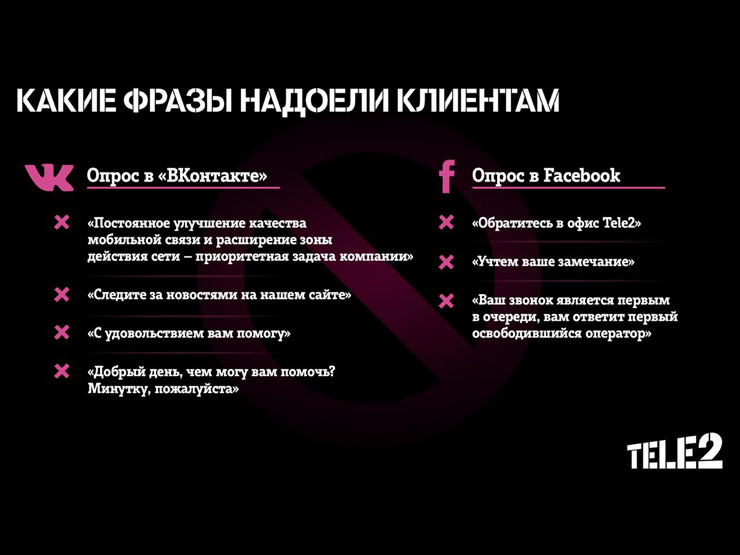 Аналогичный опрос в Facebook позволил выявить еще три фразы. Как оказалось, больше всего клиенты не любят предложение «Обратитесь в офис Tele2». Пользователи социальных сетей – это цифровая аудитория. Она привыкла решать проблемы дистанционно, поэтому необходимость офлайн-обращения воспринимается негативно.