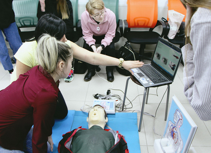 В рамках презентации проекта инструкторы вуза и колледжа показывали комплекс мероприятий для оказания первой помощи на специальных тренажёрах-манекенах, на которых показывали студентам навыки при сердечно-лёгочной реанимации.