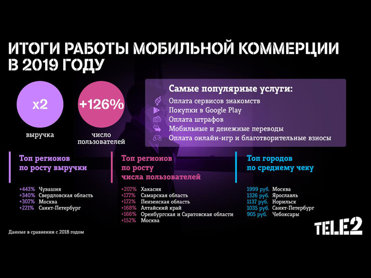 Tele2 подвела итоги работы сегмента мобильной коммерции в 2019 году. Оператор подключил более трех тысяч интернет-магазинов, онлайн-игр и различных социальных сетей, в которых можно оплатить товары и услуги со счета телефона. В целом выручка компании в этом сегменте увеличилась в два раза. Наибольший рост оборота продемонстрировала Чувашия – там он составил 443%. Следом в рейтинге регионов расположилась Свердловская область с результатом в 340%. В Москве и Санкт-Петербурге рост оборота составил 307% и 221% соответственно.