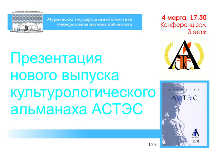 В Мурманской научной библиотеке 4 марта состоится презентация нового выпуска культурологического альманаха АСТЭС, который знакомит с новинками творчества поэтов и прозаиков, отражает наиболее яркие события и имена Кольского края.