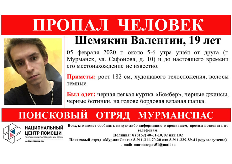 Ровно месяц назад, 5 февраля, в Мурманске пропал 19-летний Валентин Шемякин. Утром того дня молодой человек вышел от друга на улице Сафонова, оставив мобильный телефон. До сих пор о его местонахождении ничего неизвестно. На первых этапах поисками занимались волонтеры и сотрудники МЧС по Мурманской области. Были обследованы все ближайшие территории, гаражи, заброшенные здания, просмотрены записи с камер видеонаблюдения и видеорегистраторов. Была задействована даже поисковая собака.