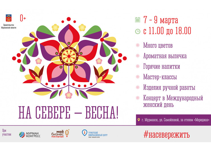 Ярмарка под лозунгом «На Севере – Весна!» продлится до 9 марта с 11 до 18 часов. Для детей будут организованы мастер-классы, продажа сувенирной продукции, выпечки и напитков. В Международный женский день на сцене выступят ансамбль солистов «Орфей», клуб авторской песни «Пять Углов», аккордеонист Сергей Макаров и акустический дуэт «ВасяНастя». Ведущими выступят мурманские КВНщики команды «Овсянка».