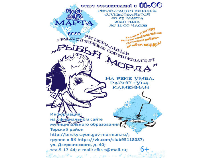 В Терском районе состоятся традиционные соревнования по спортивному рыболовству «Рыбья морда». Как сообщает районный Центр по физической культуре, спорту и туризму, самые удачливые рыболовы сразятся 28 марта на реке Умба, в районе губы Каменная.