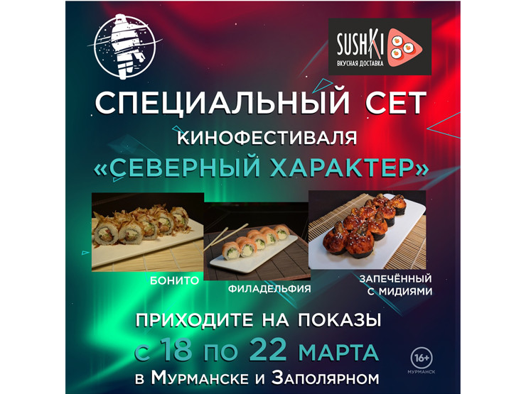 Международный кинофестиваль «Северный Характер» совместно с доставкой «СушКи» представили специальный сет. В честь этого они разыгрывают несколько сетов для подписчиков.