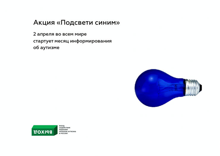 Акция «Зажги синим» пройдёт 2 апреля в городах России в честь международного дня распространения информации об аутизме. Здания, сооружения и природные объекты подсветят синим светом, который является символом заболевания. Цель мероприятия — обратить внимание общества на имеющую в стране проблему и изменить отношение россиян к страдающим от аутизма людям.