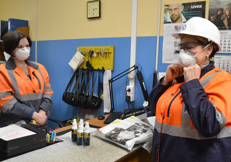 Приостановлена работа столовых и кафе на территории комбината. Блюда горнякам продаются в одноразовых ланч-боксах. Производится обработка рейсовых автобусов, доставляющих работников на промышленную площадку перед выпуском на линию и после каждого рейса. Все контактные поверхности контрольно-пропускных пунктов и помещений цехов обрабатываются раствором гипохлорита натрия каждые два часа.
